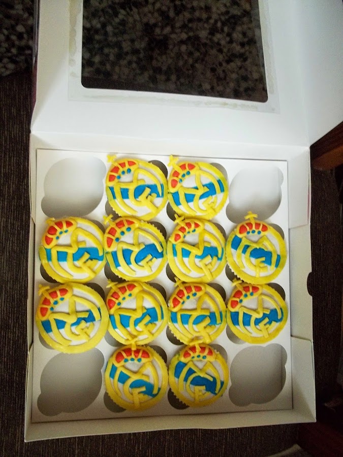 Estos cupcakes fueron un encargo que me hizo una amiga del cursillo al que voy por las mañanas. Son de chocolate y crema de avellana, el escudo está hecho con fondant. Les gustó mucho, según me dijo no le dió tiempo a probarlos, se los sacó a sus invitados y volaron XD.