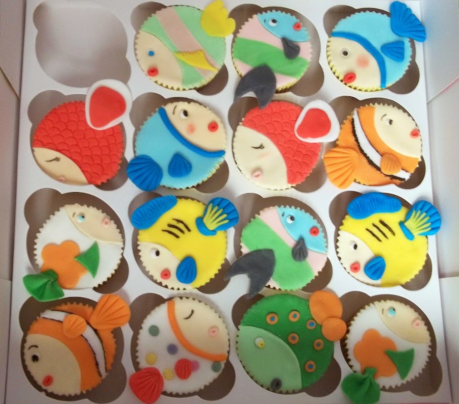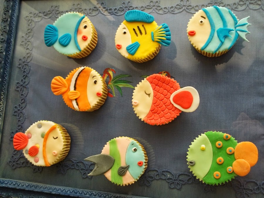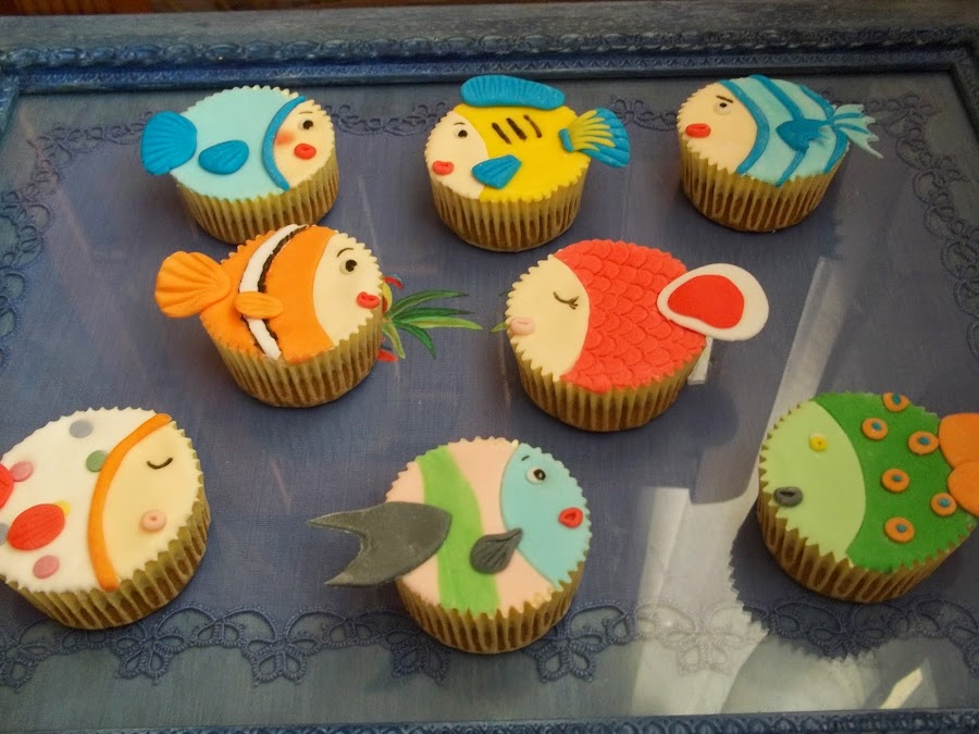 Estos cupcakes se los hice a una amiga para que los llevara a la fiesta de cumpleaños de su hija, la temática de la fiesta eran los peces así que me puse manos a la obra para realizar varios tipos de peces. Trabajé mucho en ellos, pero el resultado mereció la pena y según me dijo todos quedaron encantados con ellos. El bizcocho es de zanahoria y manzana, llevan crema de chocolate blanco y los peces son de fondant.