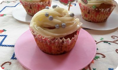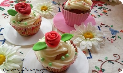 Saca del frigo y pon este frosting encima de de las magdalenas, adorna con las flores de fondant y perlitas de colores.