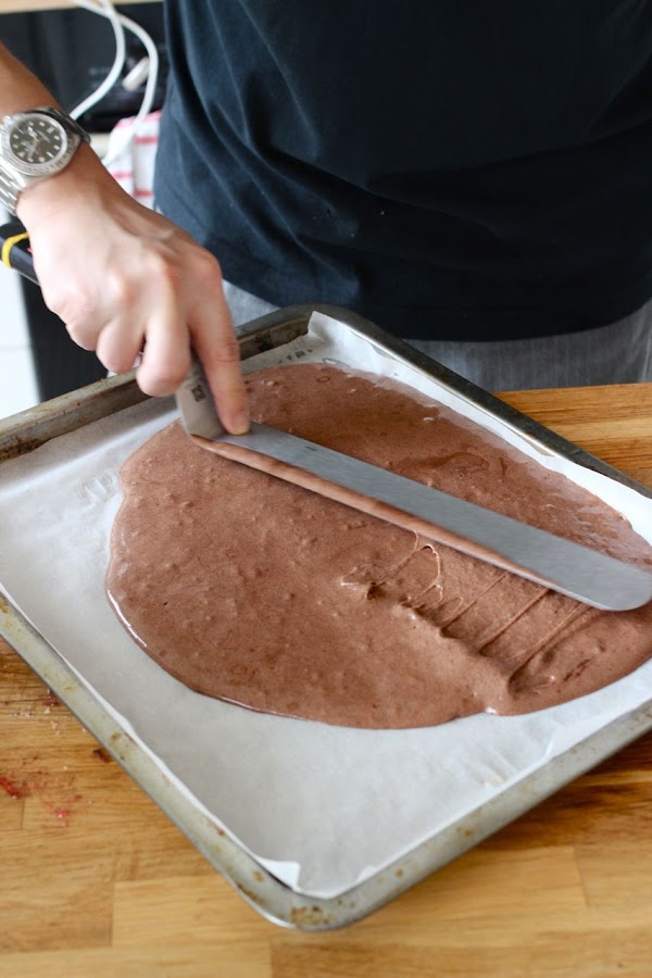 5) Vierta en una bandeja para hornear forrada con papel de hornear y se extendió hasta alrededor de 5 mm de espesor