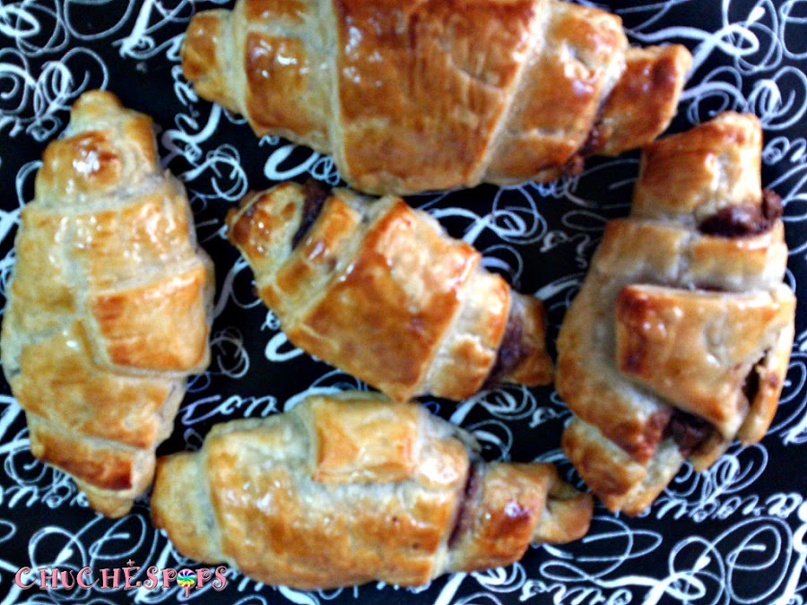 Con una espátula extender el chocolate por el hojaldre, siempre dejando los bordes sin chocolate y empezar a enrollar por la base hasta la punta, hacerlo con cada triángulo.