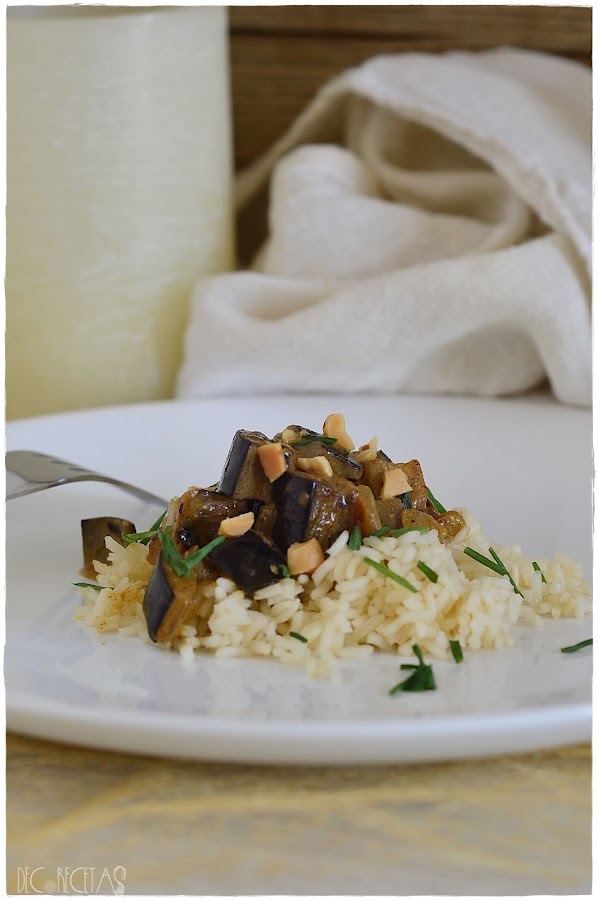 Acompañamos de cebollino y frutos secos por encima, como cacahuete y almendra, además de arroz para acompañar