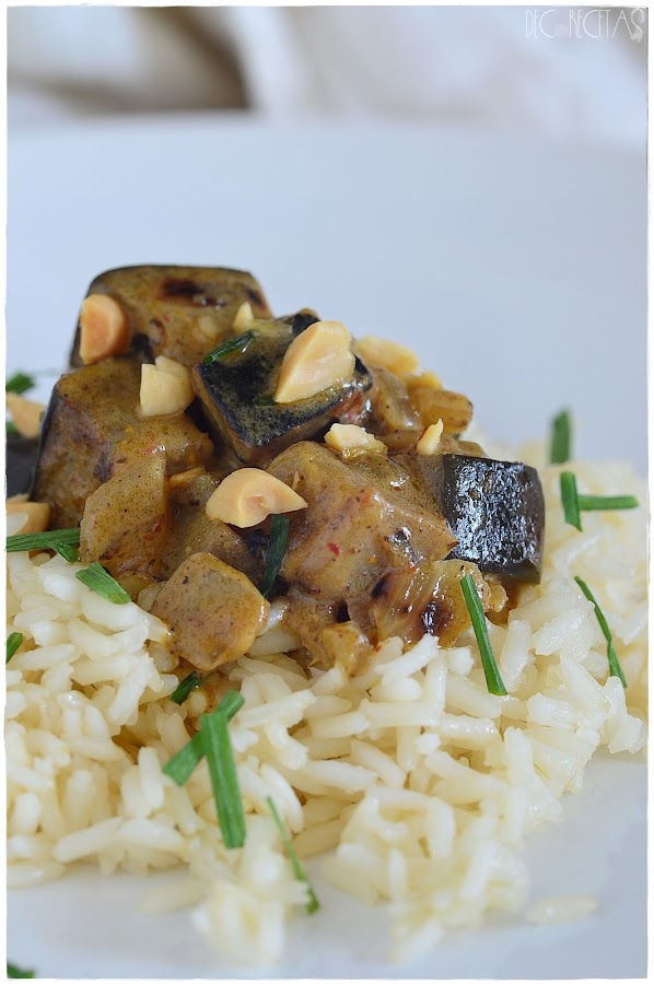 En una olla, doramos media berenjena cortada de cubitos junto con las especias de nuestro gusto, como pueden ser: nuez moscada, canela, curry, comino, cúrcuma, pimentón...Una vez dorada ligeramente, retiramos a parte, y en esa misma cazuela, doramos un diente de ajo con media cebolla, y agregamos una cucharadita de pasta de curry rojo. Cocinamos por unos minutos hasta que desprenda olor, y añadimos una lata de leche de coco. Cocinamos a fuego bajo por unos 8 minutos, agregando las berenjenas en último lugar y dejando cocinar conjuntamente por 5 minutos más.