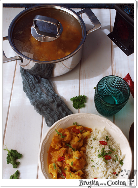 Después agregamos el tomate en dados que cocinaremos todo junto a fuego medio durante unos 5 minutos aproximadamente. Entonces agregamos el curry en polvo, lo mezclamos bien y agregamos la coliflor y los garbanzos junto con la leche de coco, lo movemos y dejamos cocinar con la tapa puesta unos 10 minutos. Queremos que la coliflor esté tierna pero que no se deshaga.