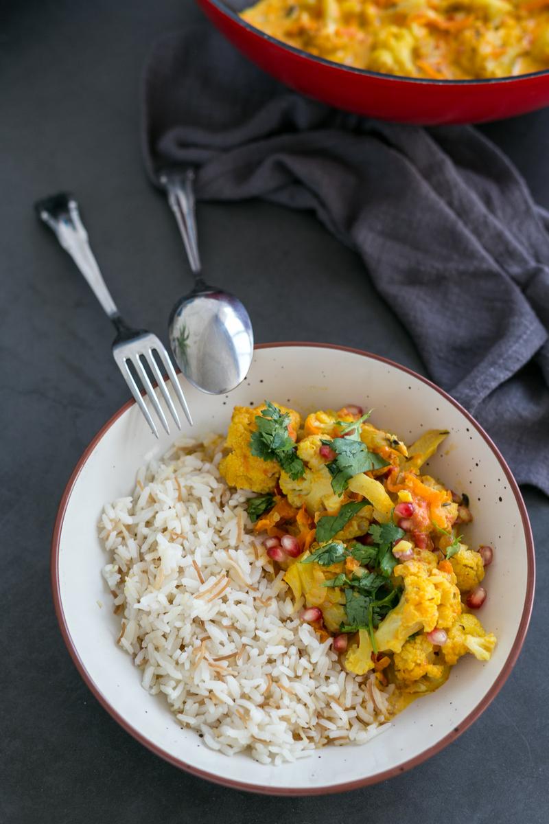 Este curry tiene una base de coliflor asada muy fácil de hacer que se le agrega a una mezcla de especias, ajo, cebolla y leche de coco entre otros. Es una receta sencilla y el resultado es realmente delicioso. Se puede acompañar de arroz, quinoa, noodles de arroz o similar.