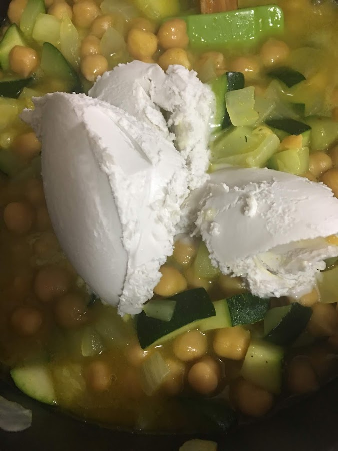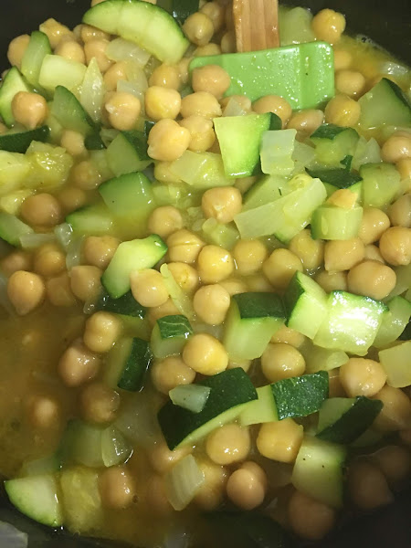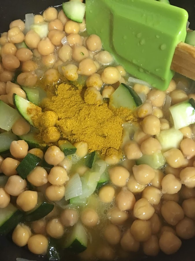 Se rehoga unos instantes. Se añaden los garbanzos cocidos escurridos y el curry en polvo.