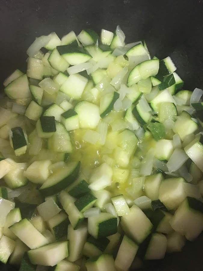 Se pone un poco de aceite de oliva en una cazuela y se calienta. Se añade la cebolleta picada y el calabacín, lavado y sin pelar, cortado también en dados. Se salpimenta.