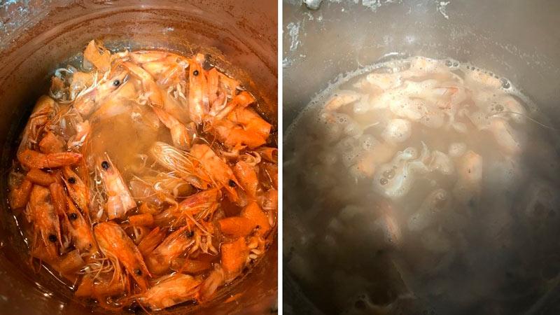 Receta de fumé de marisco: Cocer las pieles y cabezas de los langostinos para hacer el caldo
