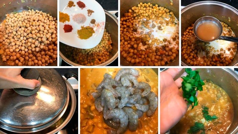 Los langostinos pelados los añadimos 5 minutos antes de aparte el curry de garbanzos del fuego para que se hagan durante los últimos minutos. No necesitan más tiempo de cocción.Y una vez que apaguemos el fuego y retiremos la olla, añadiremos las hojas de perejil fresco y lo mezclaremos con los demás ingredientes.