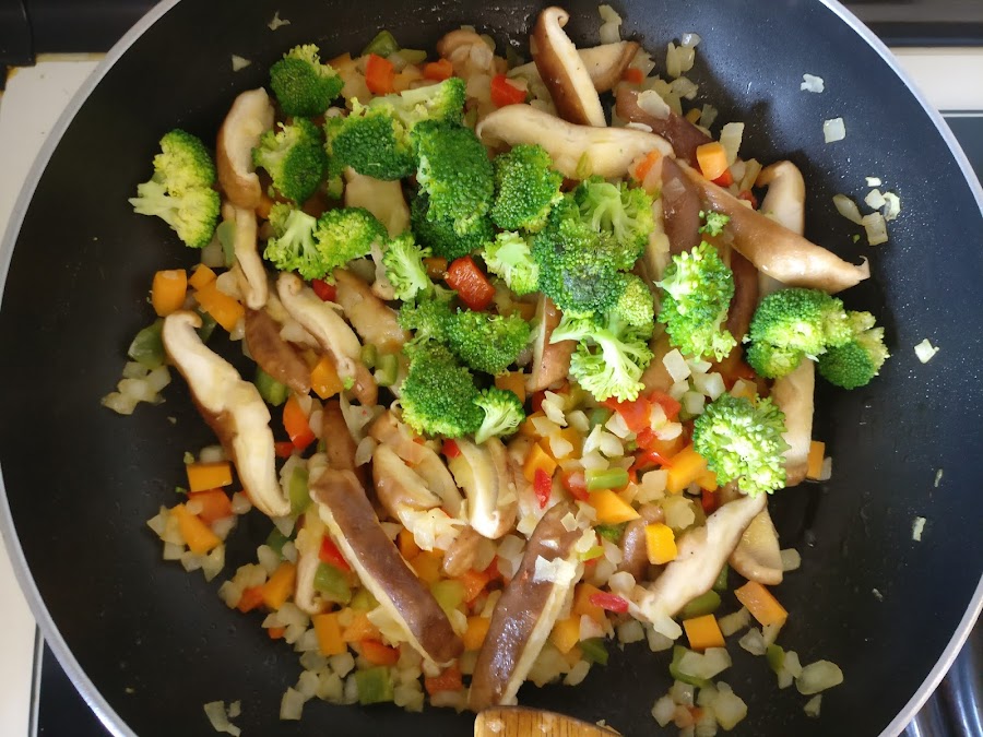 Separamos las flores del brócoli y las añadimos a las verduras. Salteamos a fuego medio 2-3 minutos.