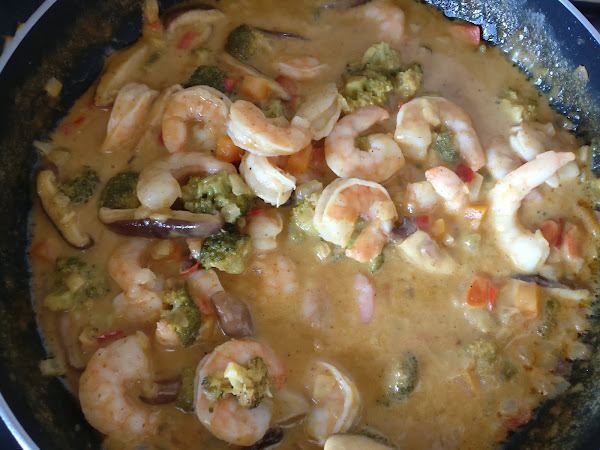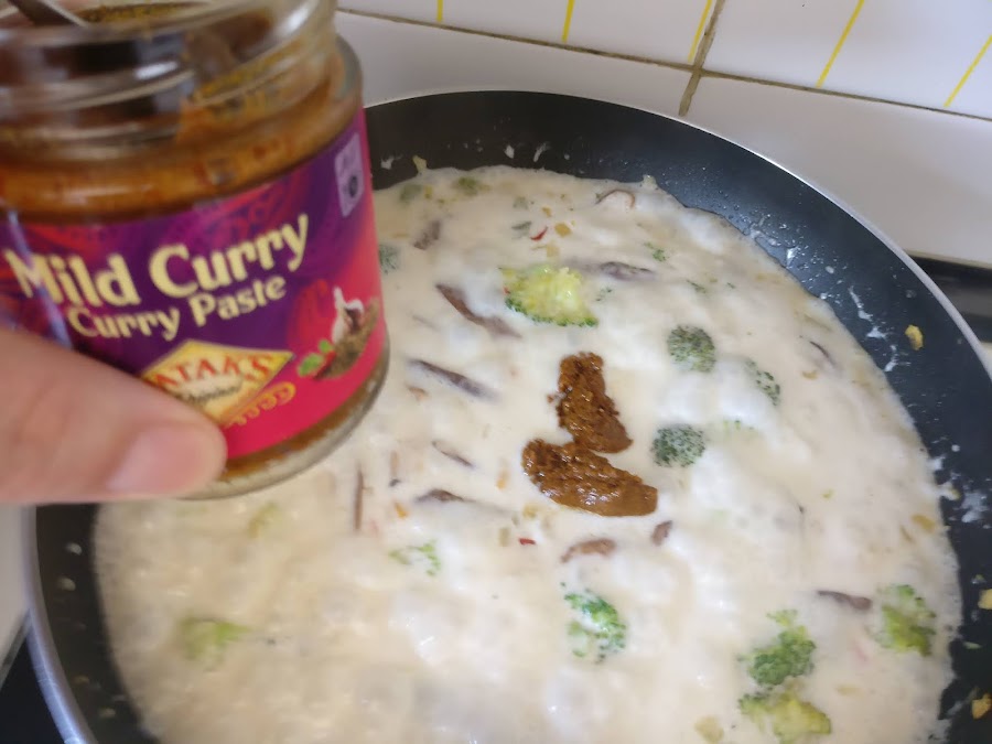 Sazonamos con la pasta de curry y dejamos reducir a fuego bajo unos 5 minutos, hasta que veamos que la salsa se empieza a espesar.
