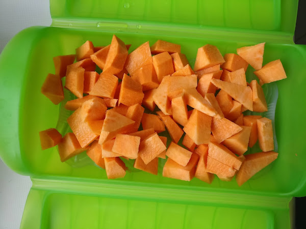 Lo primero que haremos será pelar y cortar el boniato a dados. Seguidamente lo cocinaremos en el estuche al vapor de Lékué con un poco de agua al microondas a 700W durante 4 minutos.