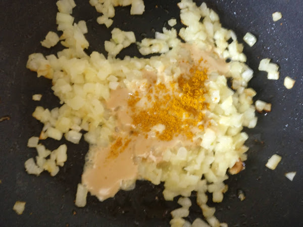 Cuando la cebolla esté tierna añadiremos una cucharada de tajini, curry y jengibre en polvo y mezclamos bien.