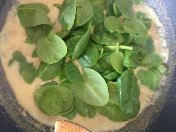 Pasado ese tiempo agregamos las espinacas baby y dejamos cocinado tapado un par de minutos.