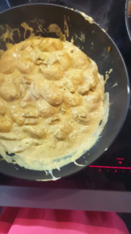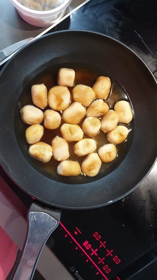 Ponemos los ñoquis a cocer a fuego fuerte con un chorrito de agua, hasta que casi se evapore. Estos ñoquis necesitaron un poco más de agua de lo normal porque eran muy grandes e iban rellenos de tomate y mozzarella.