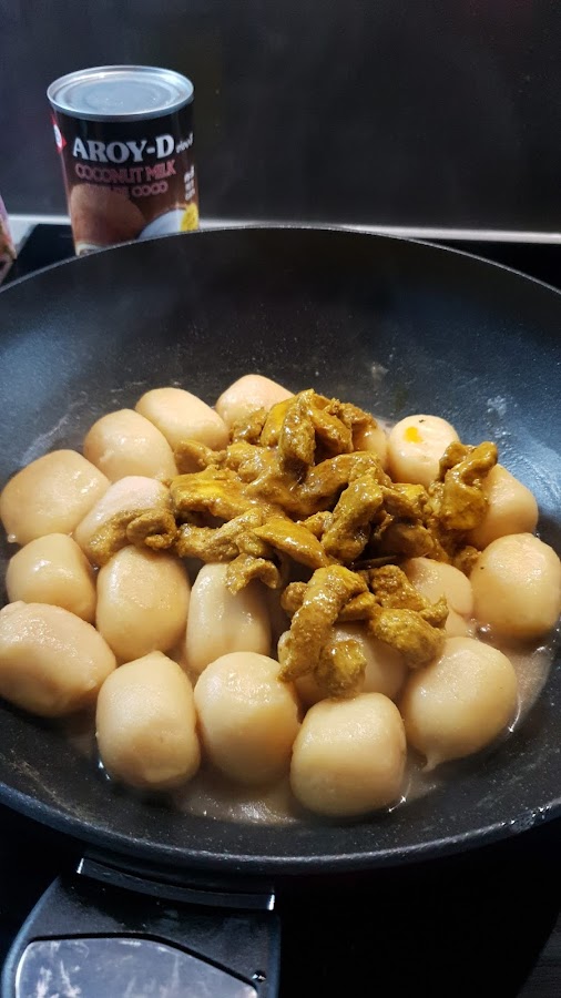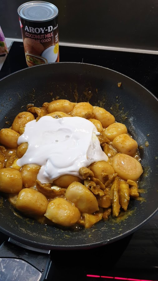 Rehogamos un minuto y echamos el bote de leche de coco. Aconsejo ir añadiendo a pocos. Yo primero le echo media lata, remuevo, dejo que cueza un poco y luego voy viendo, según quiera que me quede mas salsa o mas seco.