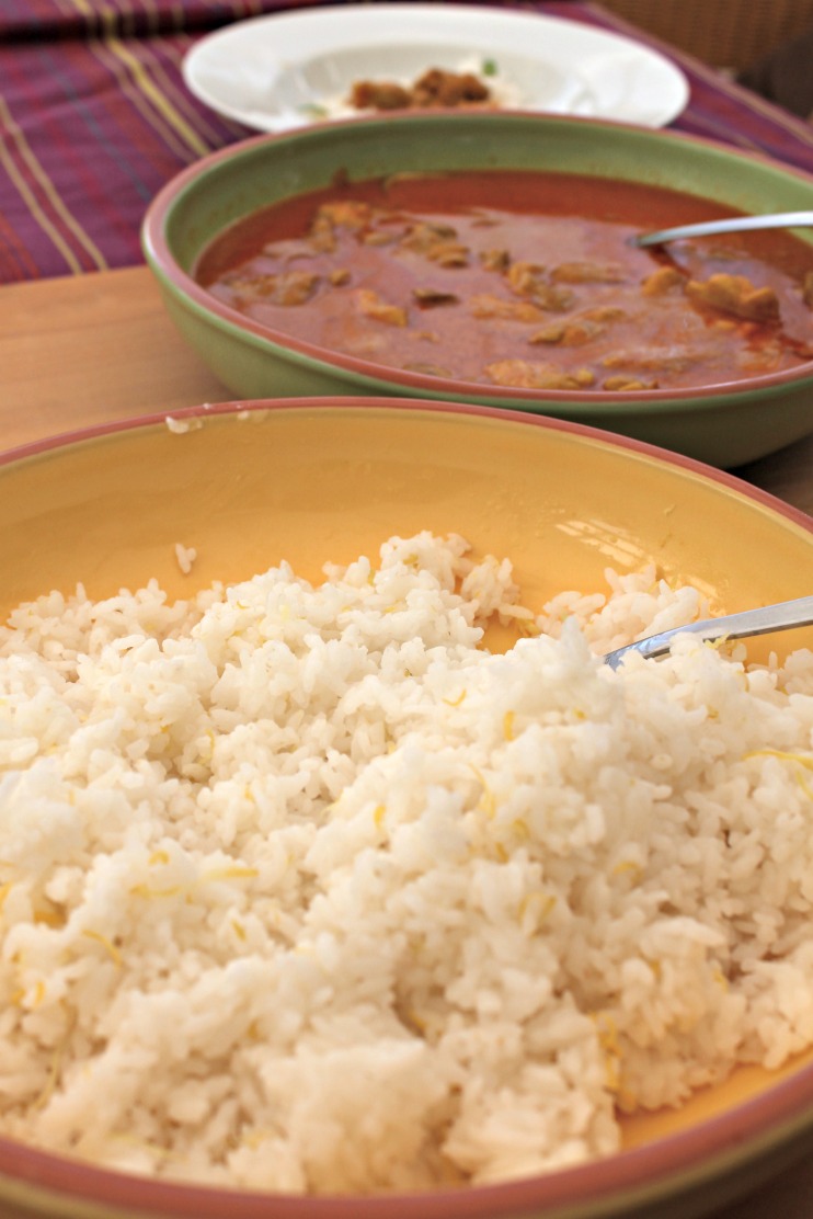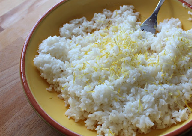 Vierte el arroz en un plato hondo, grande. Un hilo de aceite, y rallas la piel de un limón por encima, remueves...