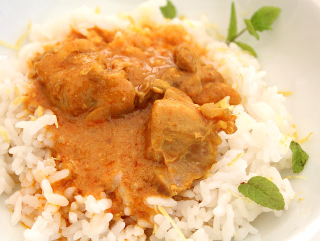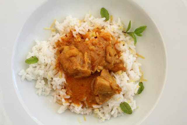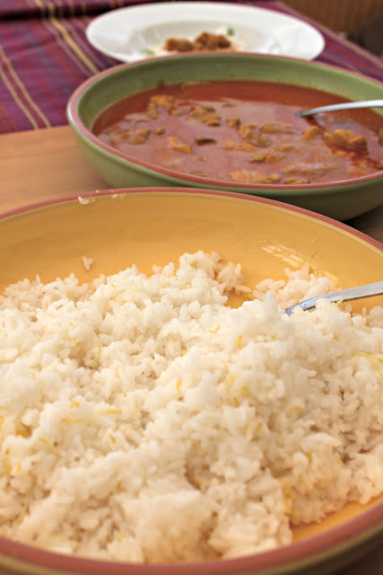 Arroz en el plato y cucharón de pollo con salsa. Y venga de salsa.