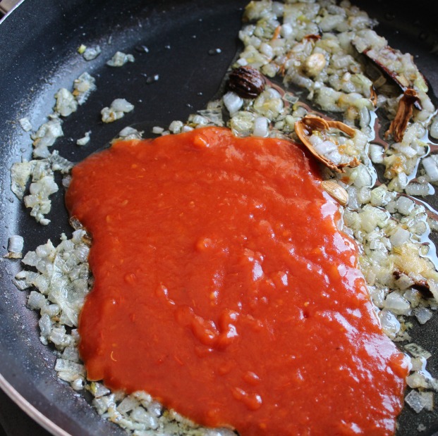 Ponemos una cucharada de la pasta en el sofrito. Fuego muy bajo.