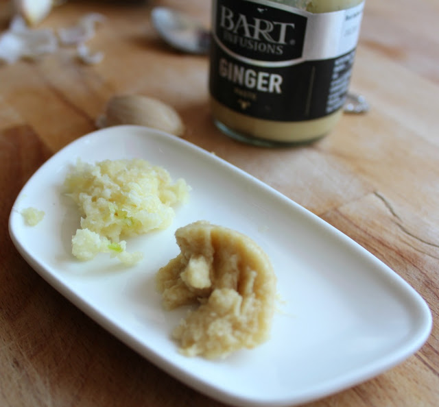 1 cucharada de pasta de ajo y jengibre (50% de ajo y 50% de jengibre. Emulsionar con un poco de aceite vegetal)