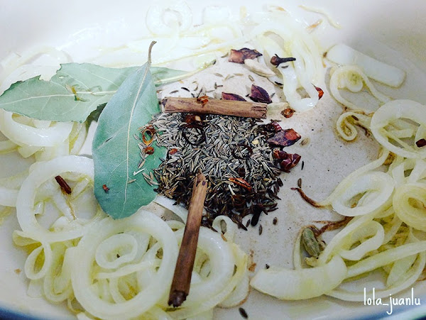 Añadimos las hojas de laurel, los clavos, el comino, el anis, el cardamomo, la canela partida por la mitad y la guindilla. Sofreímos durante 3 o 4 segundos.