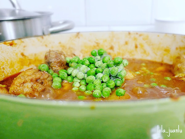 Transcurrido este tiempo destapamos, añadimos los guisantes y cocinamos 10 minutos más o hasta que el pollo y las patatas estén listas, tiernas y las salsa espesa.