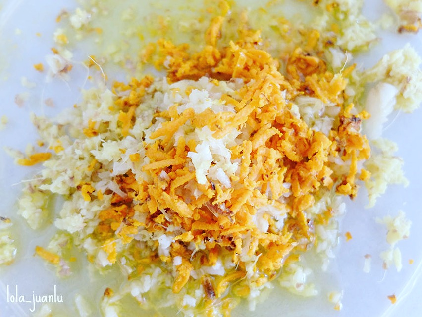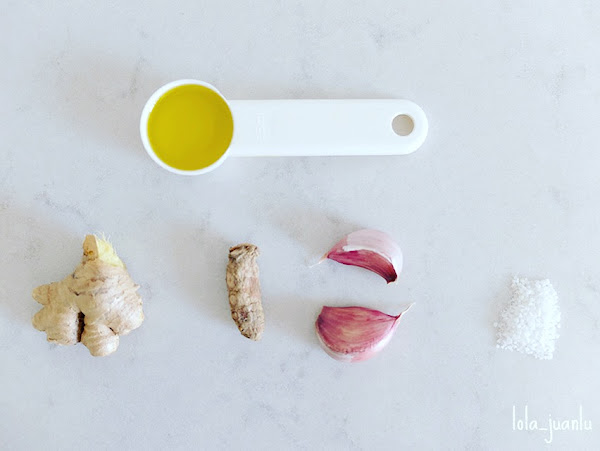 Lavamos y rallamos un trozo de jengibre del tamaño de un pulgar. También lo podemos pelar antes de rallarlo. Lo echamos en un recipiente con tapa. Hacemos lo mismo con un trozo de cúrcuma. Pelamos y rallamos dos dientes de ajo. Añadimos sal al gusto y una cucharada de aceite de oliva virgen extra.