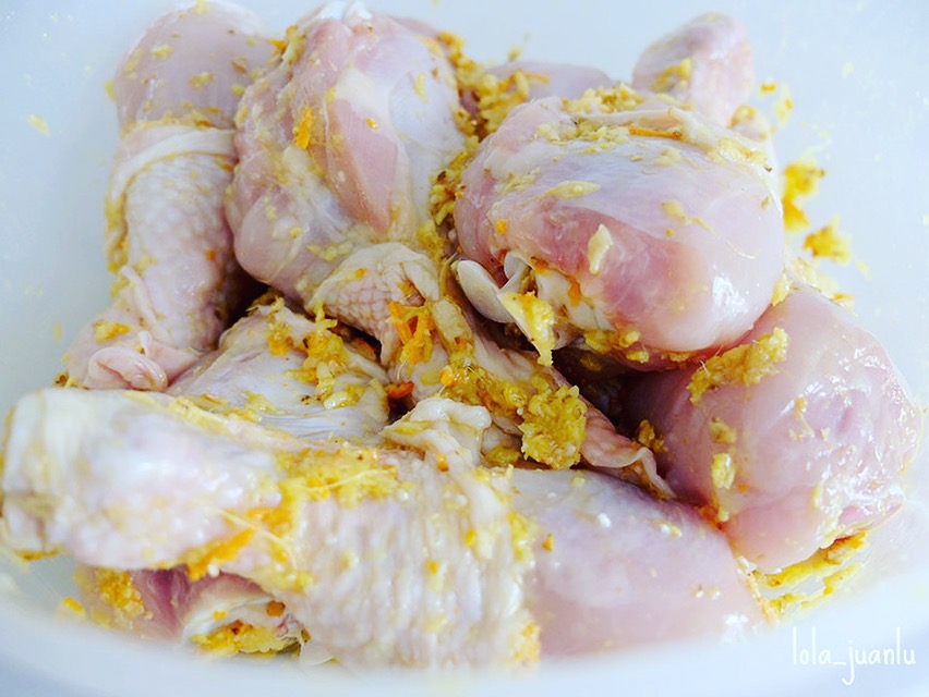 Mezclamos bien, introducimos los muslos y masajeamos hasta que la carne esté totalmente impregnada de la mezcla. Reservamos en la nevera hasta que la necesitemos.