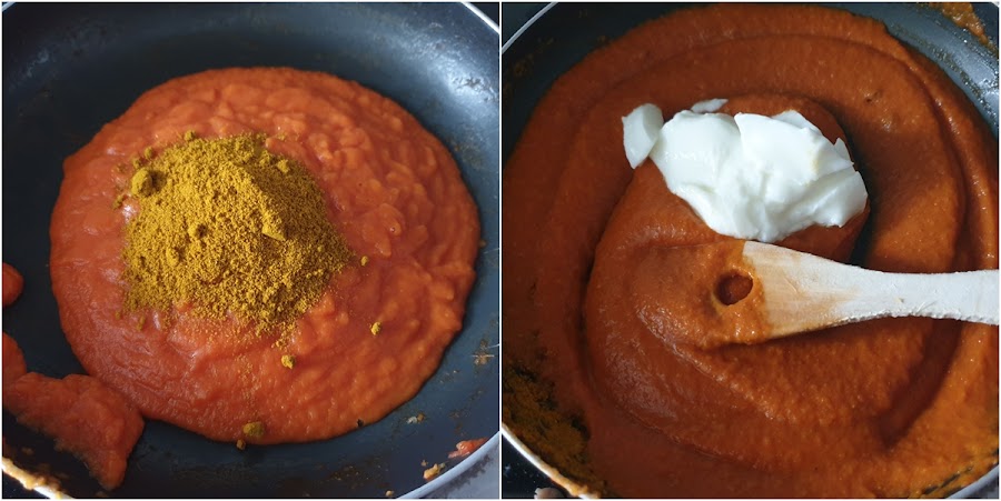 6. - Volvemos a echar el tomate en la sartén y le añadimos el curry, removiendo bien, y por último, le añadimos el yogur y volvemos a mezclar.