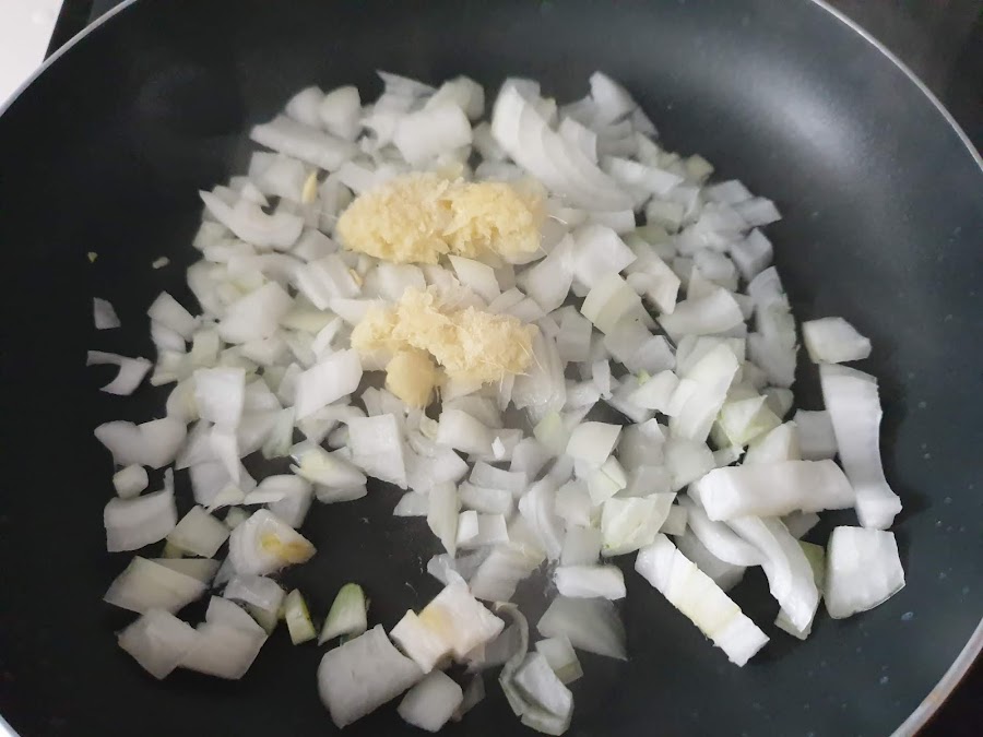 2. - Mientras, rallamos aproximadamente 1 cucharada sopera de jengibre. El jengibre fresco es mucho más aromático que en polvo. Y lo añadimos a la cebolla.