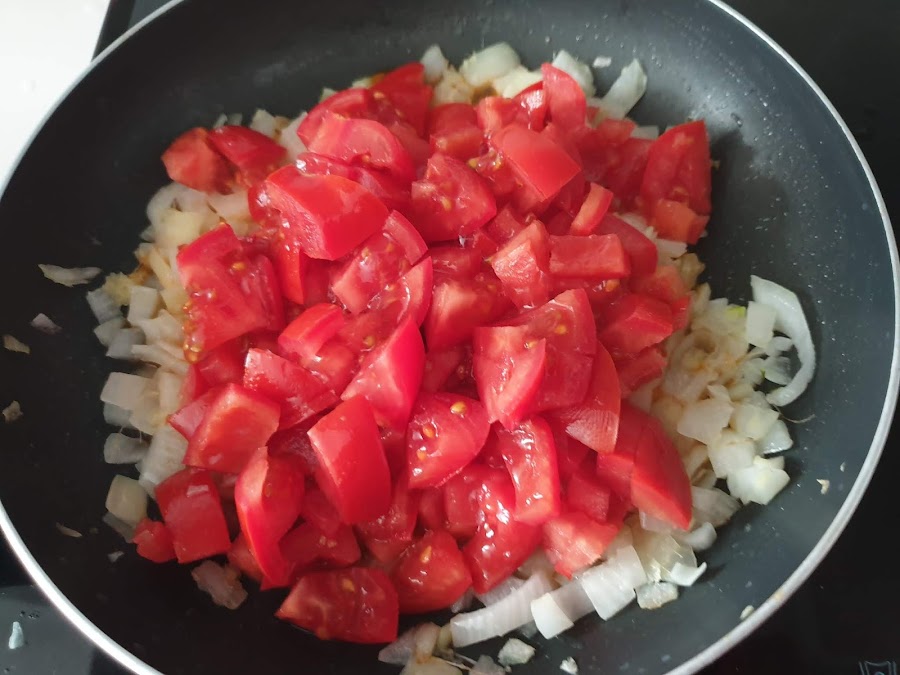 3. - Troceamos los tomates y cuando la cebolla empiece a tomar color, los añadimos a la sartén, y dejamos cocinar durante unos 15 minutos.