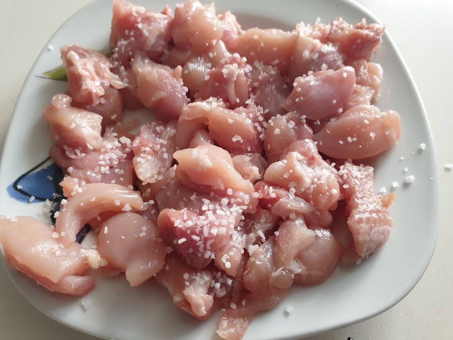 4. - Mientras, troceamos el pollo y lo salamos, lo ponemos en una sartén con un poco de aceite .