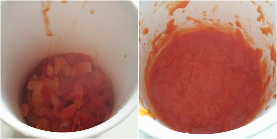 5. - Y mientras se hace el ollo, pasamos el sofrito a un vaso batidor y lo trituramos bien, yo después lo he colado, pero tampoco es necesario.
