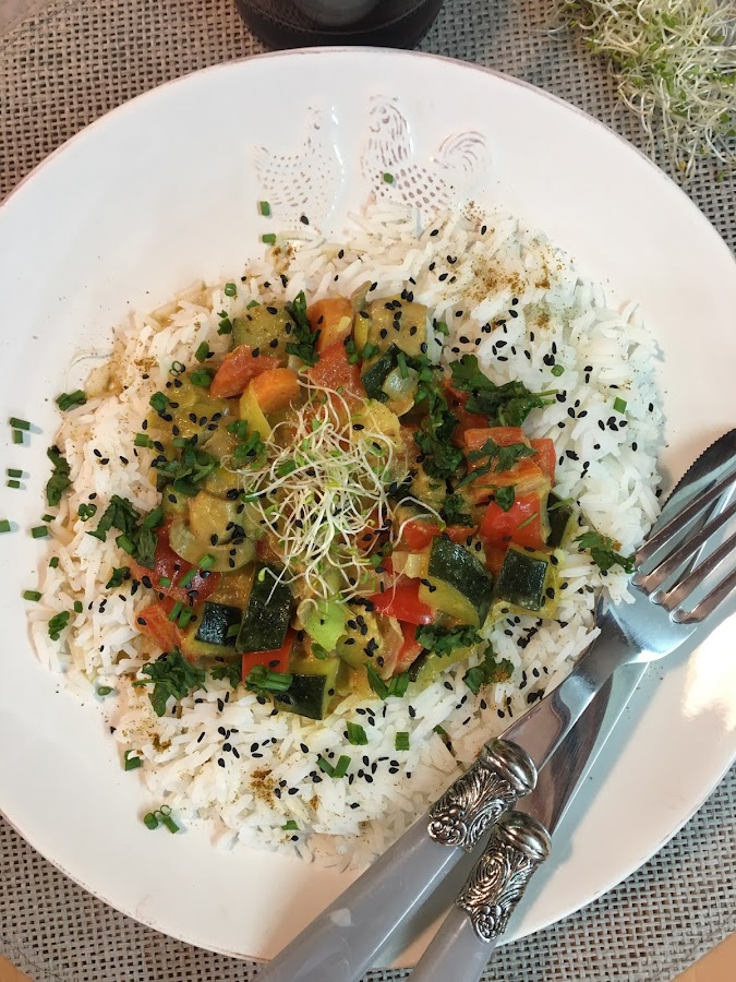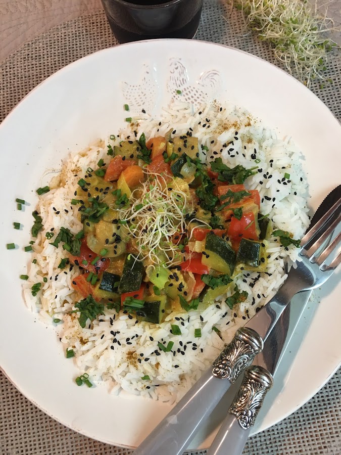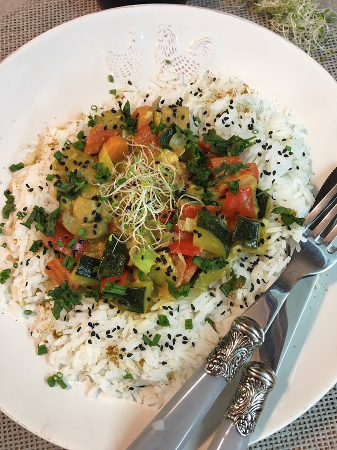 Una vez cocido el arroz se emplata. Se pone un poco de arroz en cada plato, se coloca en el centro el curry de verduras, se espolvorea con el sésamo negro y las hierbas frescas lavadas y picadas (cilantro, perejil o cebollino) y se sirve de inmediato.