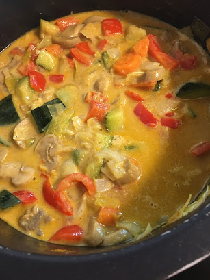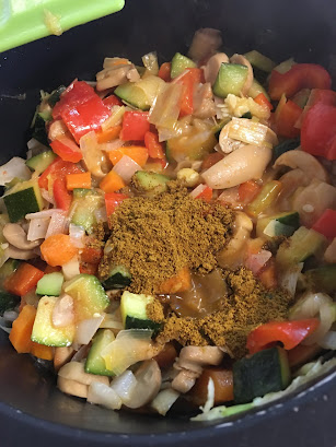 Mientras tanto se añade el curry y la pizca de comino extra a las verduras, se remueve con una cuchara de madera y se añade la leche de coco.