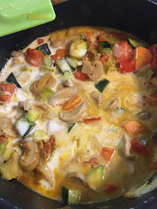 Se remueve todo y se deja que dé un hervor. Se añade el apio lavado y cortado a la mezcla de verduras con la leche de coco.