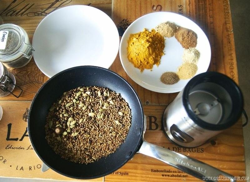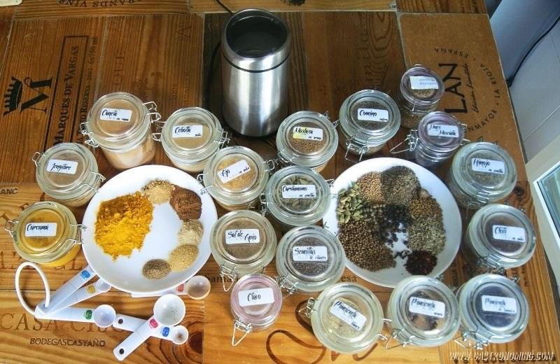 No importa las especias que tengas en polvo o en grano, quiero decir, yo hice la receta así porque era de las especias de las que disponía y como las tenía, no tiene que ser exactamente unas enteras y otras en polvo, aunque si bien es cierto mientras más de estas especias tengas enteras el sabor final será más intenso, calienta todas las que tengas enteras y las que tengas en polvo simplemente las mezclas, a decir verdad, si tuvieses todas las especias en polvo te bastaría con mezclarlas y listo, ya tendrías tu curry hecho, pero créeme, tostar las especias enteras le da una profundidad e intensidad de sabor a tu curry que parecerás un experto en especias. Si te falta alguna especia tampoco te vuelvas loco, no la pongas y ya! eso sí, que no te falte una de las básicas. Si a esta mezcla le añades agua o aceite y vinagre puedes formar lo que conocemos como curry en pasta, puedes hacer la molienda de especias en un mortero o más cómodamente con un molinillo para moler café, yo uso uno solo para hacer mis mezclas de especias, un vicio.