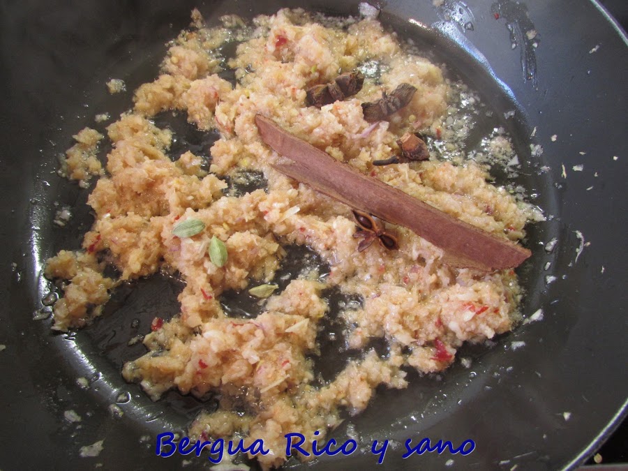 2. Calentamos el aceite en una sartén antiadherente e incorporamos la pasta fresca de especias del paso 1. Inmediatamente añadimos también la canela, el clavo y el cardamomo y el anís. Lo movemos para que se mezclen los sabores y despidan su aroma.