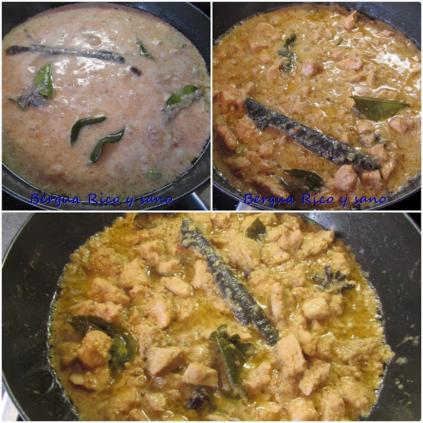 El Rendang se puede hacer con diferentes tipos de carne; este es de pollo: Chicken Rendang. La receta la saqué de aquí, pero muchas de las medidas eran demasiado imprecisas y las he concretado aquí en mi versión. Asimismo, veréis que el color del Rendang puede ser más o menos rojo según la cantidad de chili que se le ponga. La receta original decía 10 chilis, y a mí me gusta el picante, pero sabía que mi vikingo no podría comérselo, así que usé medio chili con sus semillas y saqué a la mesa chili en polvo para mí. A consecuencia de ese cambio, el color de mi curry no quedó tan vibrante, pero para compensar un poco, añadí media cucharadita de cúrcuma en polvo. Así que ya sabes, a más rojo, más picante.