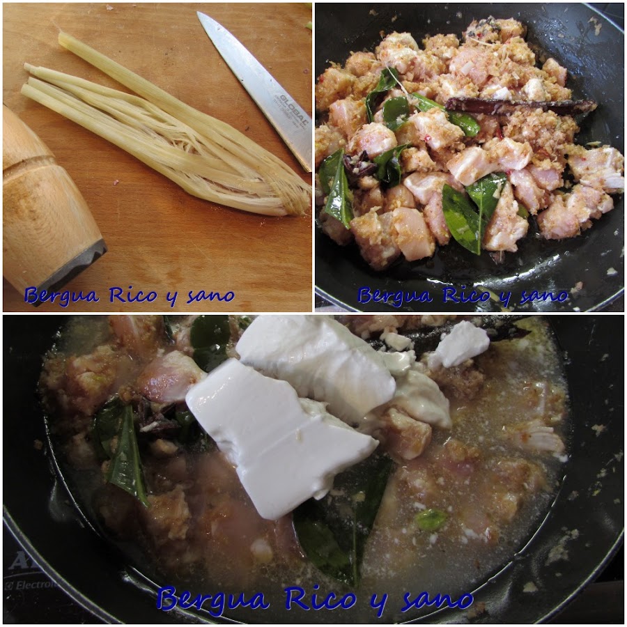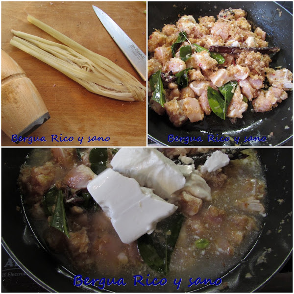 3. Entonces incorporamos el pollo troceado (trozos de tamaño de bocado) y la parte tierna de la citronela, que en este caso habremos golpeado y cortado en tiras para liberar su fragancia. También podemos echar ya las hojas de kaffir y la pasta de coco y removemos para mezclar bien con el resto. Si rompemos un poco las hojas de lima, mejor, porque soltarán todavía más aroma. Mezclamos bien con las especias y en seguida vertemos el agua y la leche de coco y le damos unos 5 minutos a fuego medio para se cocine a medias.