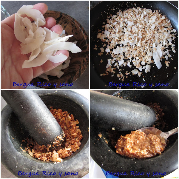 * El kerisik o pasta de coco lo podemos comprar o hacer en casa; yo lo hice casero y quedó genial. En Malasia e Indonesia se hace con coco fresco, pero si solo tenemos coco deshidratado, también podemos hacerlo; os cuento el truco. Se trata de tostar el coco en virutas en una sartén y luego machacarlo bien en un mortero para que el coco suelte su grasa y se forme una pasta húmeda.