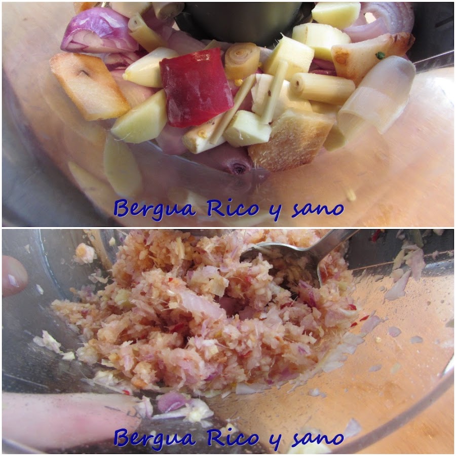 1. Para preparar la pasta fresca de especias, vamos a picar los ingredientes: Las chalotas peladas y cuarteadas, galangal fresco o descongelado pelado, jengibre fresco pelado, la parte tierna y blanda de la citronela, los dientes de ajo y el chili fresco. Se puede hacer a mano, pero tiene que quedar finísimo, así que recomiendo usar una picadora eléctrica.