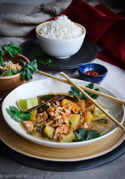 Para no alargarme mucho más (visto está que me emociono mucho hablando de la cocina asiática), voy a pasar a hablar de la receta que traigo hoy, este curry Massaman, un plato que cuando probé me dejó anonadada de lo increíblemente bueno que me pareció. Habiendo probado muchas versiones de otros currys como el amarillo, rojo, verde, este en concreto me sorprendió por ser mucho más suave en cuanto a picante se refiere, pero sabrosísimo y especiado, con un toque de dulzor que lo hace distinto al resto. El Massaman es de hecho un tipo de curry rojo, y este color se lo da el chile rojo, pero en este caso es mucho menos intenso de color y sabor ya que lleva mucha menos cantidad. Se podría decir que es de los currys más suaves que hay en la cocina tailandesa, por lo que es ideal para aquellos a los que el picante no les hace mucha gracia.