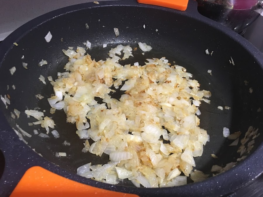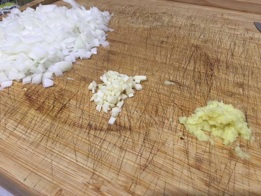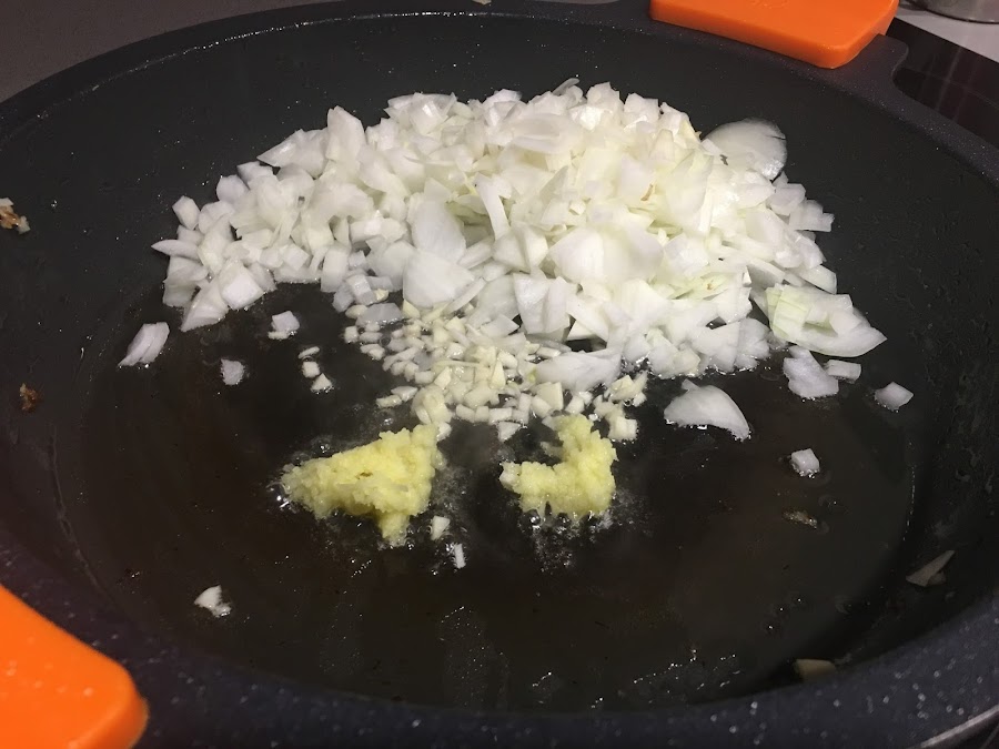 4. Añade el aceite restante al mismo wok. Sofríe a fuego medio el ajo y la cebolla picada junto con la media cucharada de jengibre fresco rallado hasta que la cebolla esté tierna y doradita.