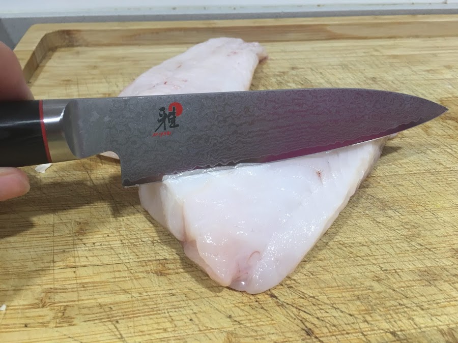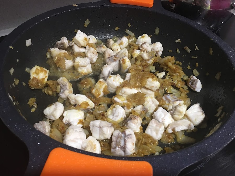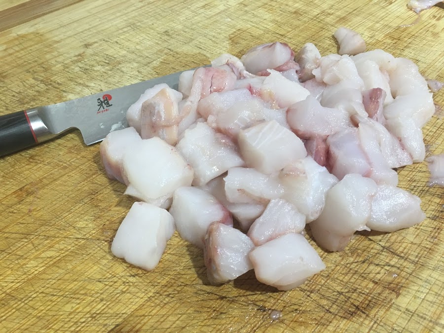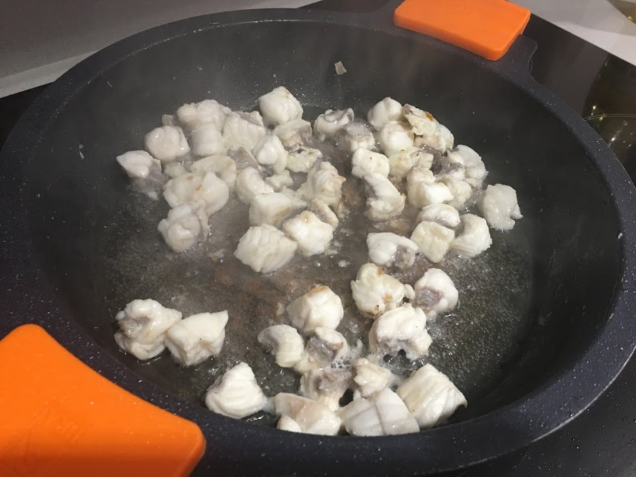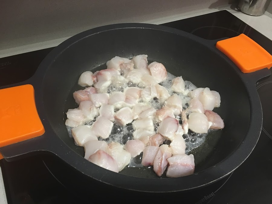 2. Calienta la mitad del aceite de cacahuete en un wok o cazuela. Corta a dados el pescado, como ya os he comentado yo he usado rape, compré la cola entera a lomos y en casa la corté a dados. Si no tenéis un cuchillo bien afilado pedir al pescadero/a que os lo prepare.