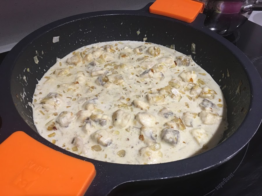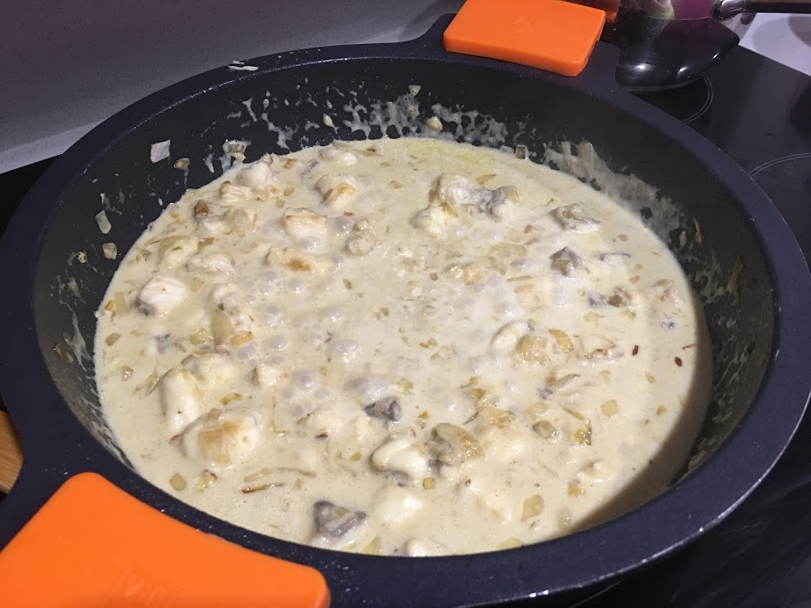 7. Añada los 200ml de leche de coco y cocina durante dos minutos más.