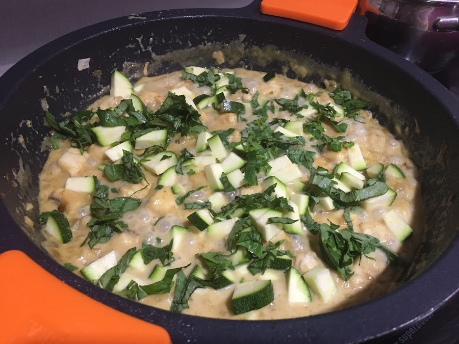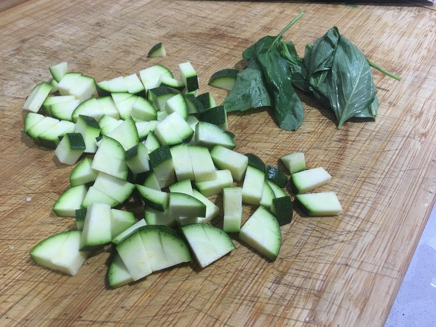9. Añade el medio calabacín lavado y sin pelar cortado a dados medianos y la albahaca fresca lavada y picada. Cocina 5 minutos más.