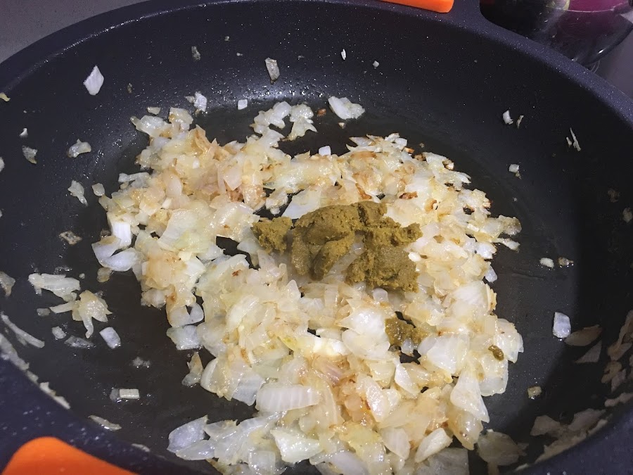 5. Añade la cucharada de pasta de curry y remueve durante 3 minutos, hasta que se empiece a desprender el aroma. Es muy aromático y te cautivará.