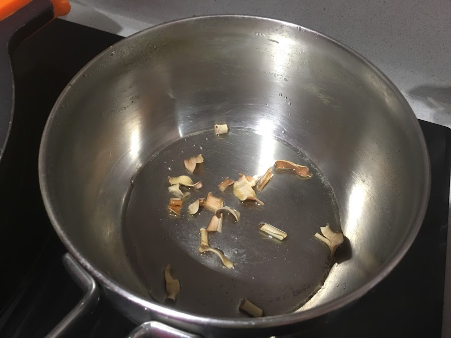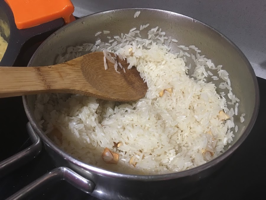 10. Mientras termina de hacerse el curry verde de pescado preparar la guarnición. Para ello lava el arroz 2 veces, sabremos que está limpio cuando el agua salga totalmente clara sin pizca de almidón. Deja que seque en el escurridor. Una vez seco pon en una olla un poco de aceite y sofríe un par de minutos el lemon grass junto con el arroz jazmín. Cubre de agua y deja hervir a fuego medio durante 18 minutos. Escurre y reserva para la guarnición.
