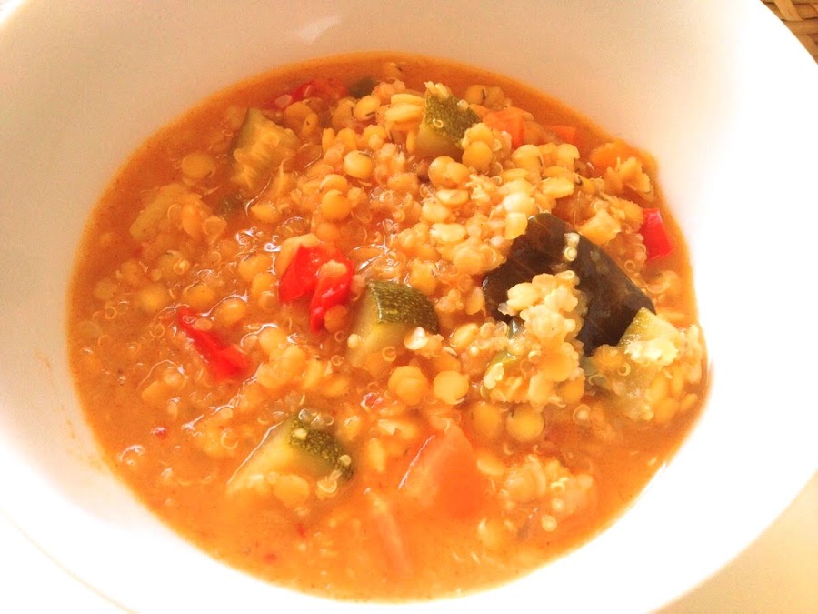 Incorporamos la quinoa y las lentejas y cocinamos todo a fuego lento durante 10 minutos.
